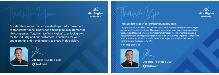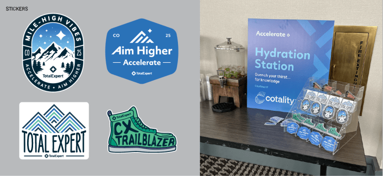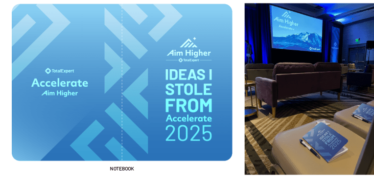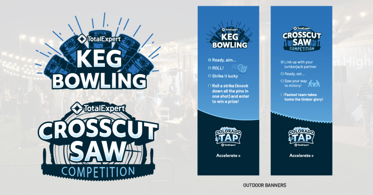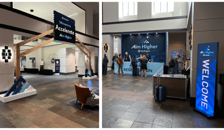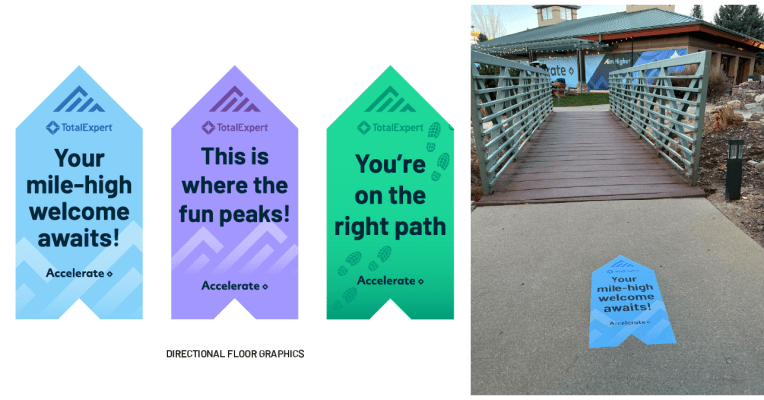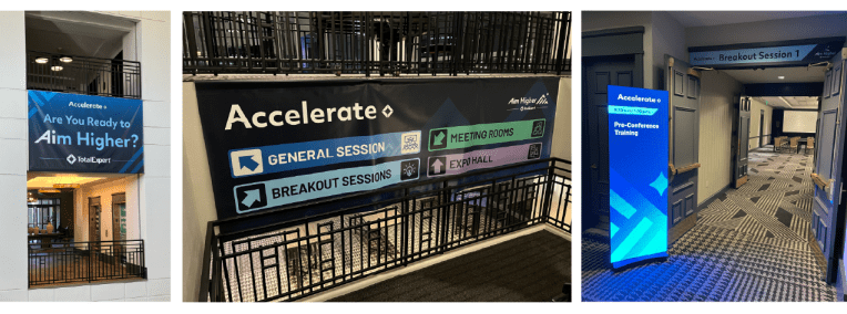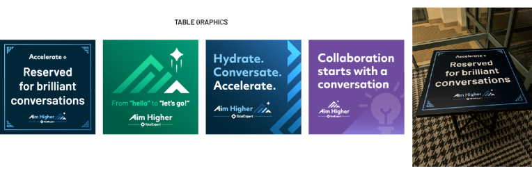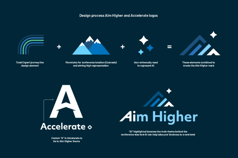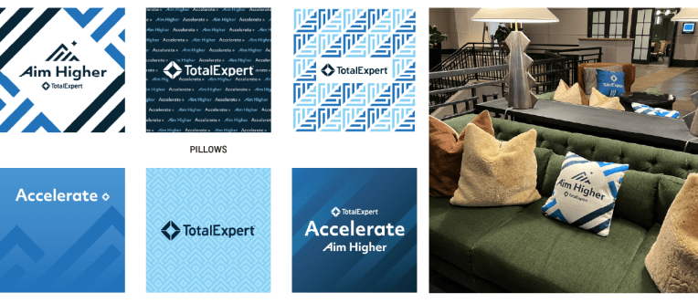 I had the opportunity to create the brand and design assets for Total Expert’s customer conference, Accelerate Aim Higher, which took place in Denver, CO. The Aim Higher theme focused on how Total Expert customers can leverage Total Expert and AI products to take their business to the next level, which is why “Ai” is highlighted in logo. For the conference I designed the logos, hotel signage, booths, banners, keynote presentations, pillows, name badges, giveaways, and digital assets.
