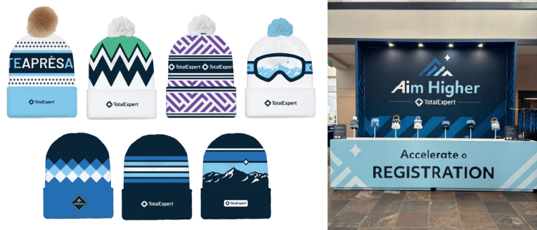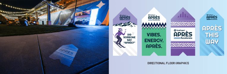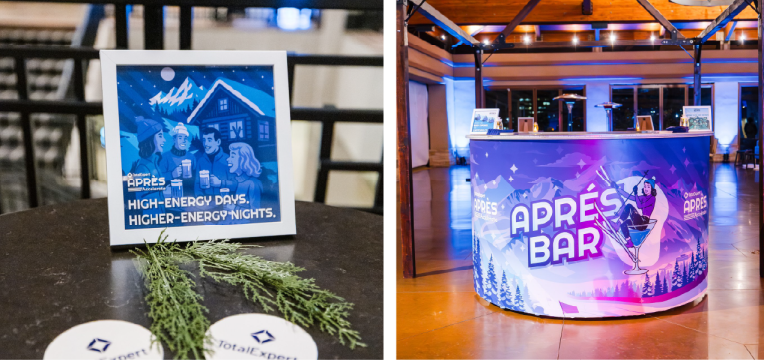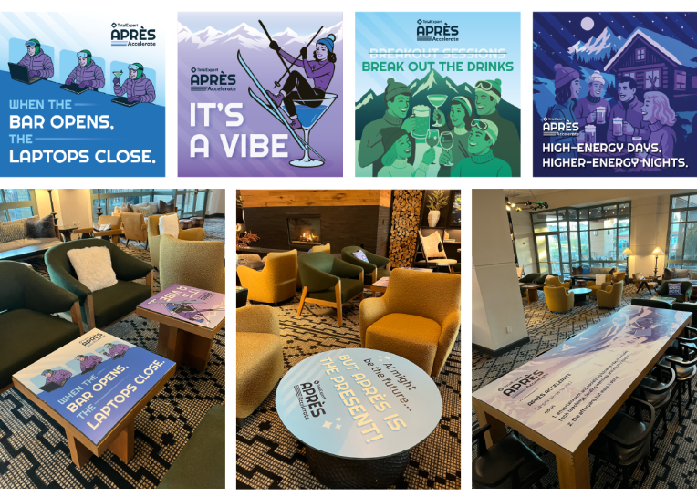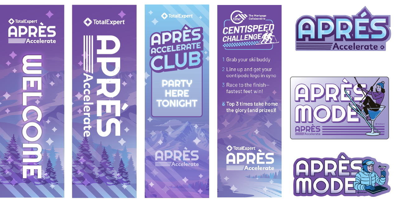 Did someone say “Aprés”? Apres Accelerate was a branded party for the attendees of the Total Expert conference— Accelerate Aim Higher. It took place in Denver, CO and was at the end of the conference so naturally Aprés was the perfect theme. I had the honor to create the party logo and branding. Leaning fully into the Aprés theme I designed table graphics, custom winter beanies, booths, banners, directional signs, and helped create a fun Aprés atmosphere.