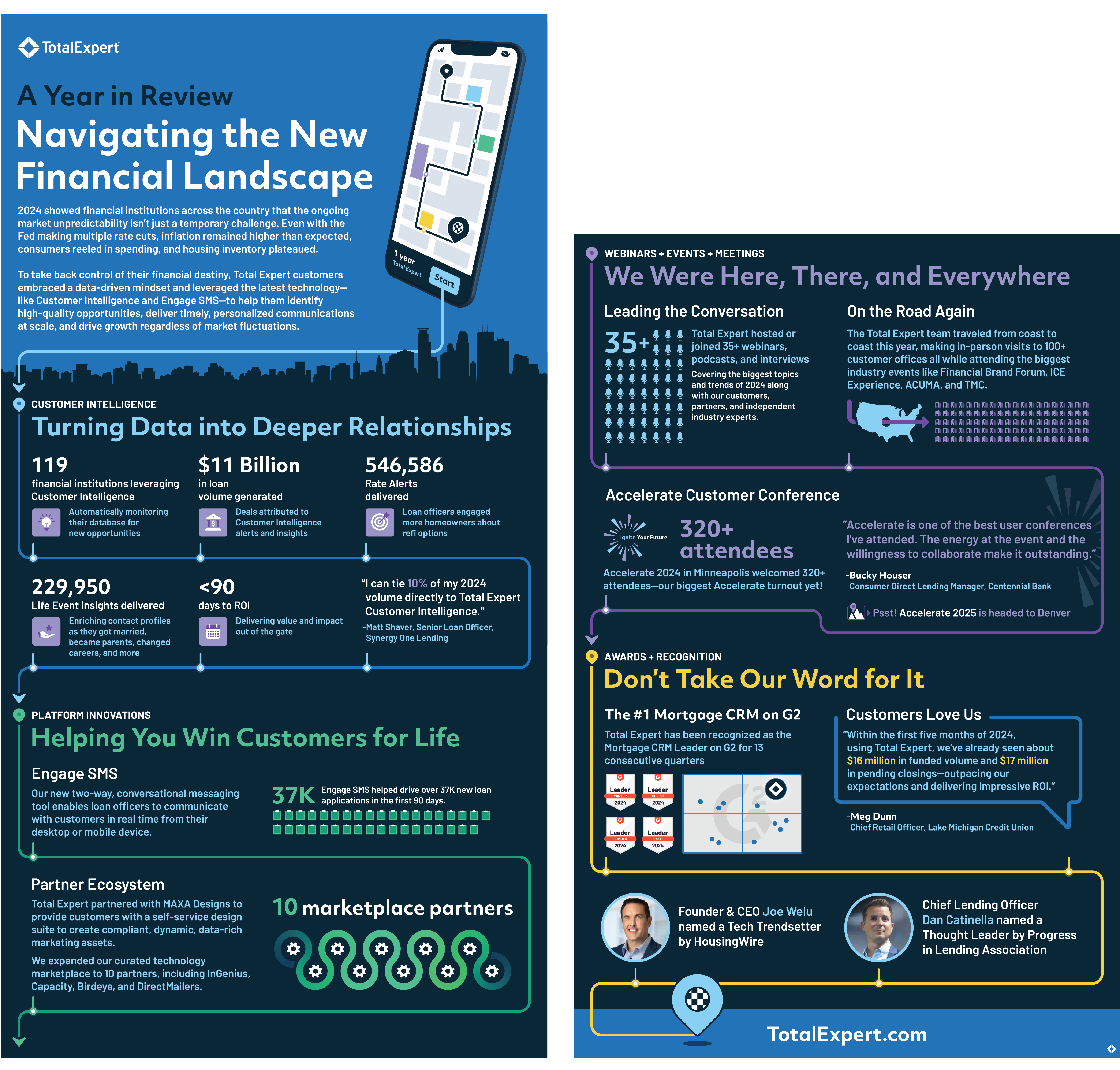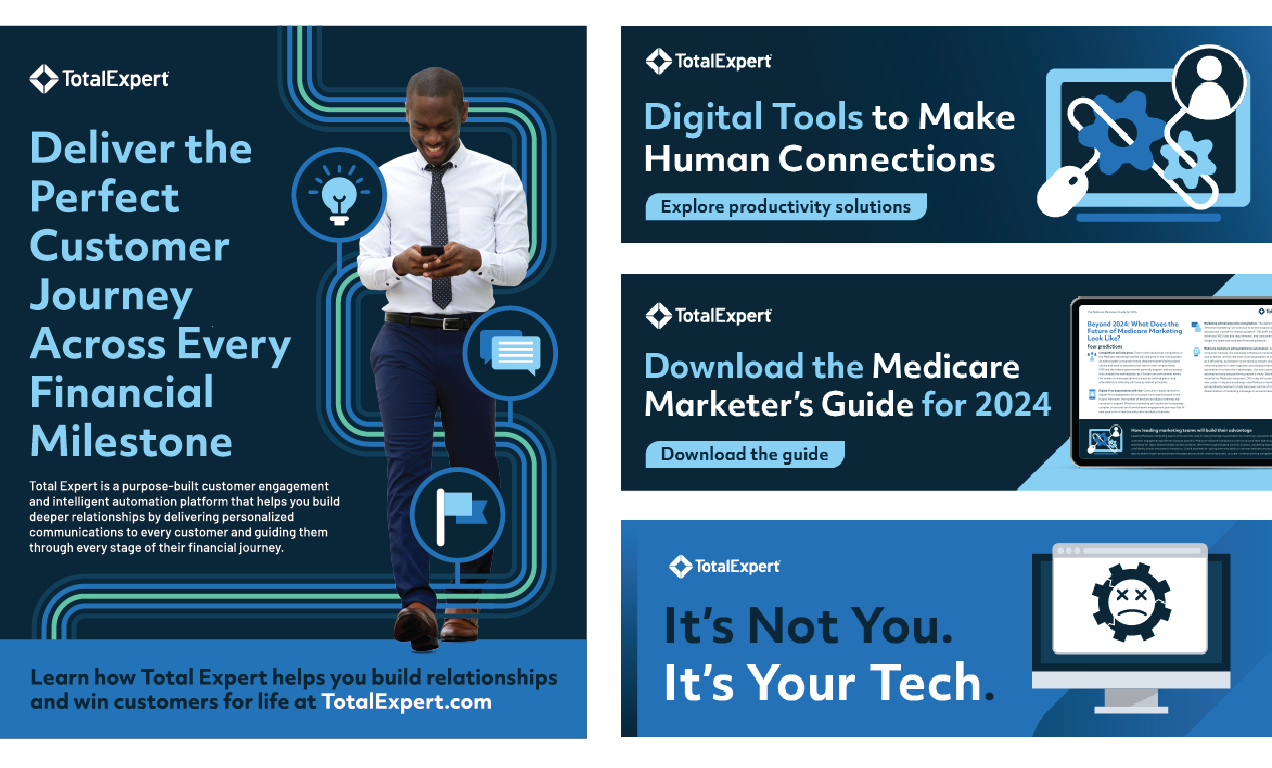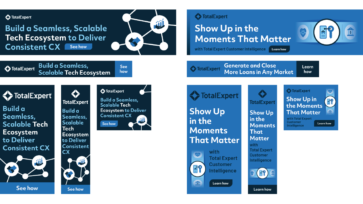 Total Expert is an industry leading SaaS company that enables modern financial institutions to engage and guide consumers. As the lead designer I helped to strengthen and grow the Total Expert brand. Working with marketing managers, copywriters and sales executives I created successful designs including: tradeshow displays, social campaigns, ebooks, emails, print collateral, logos, presentations, digital displays and everything in-between.